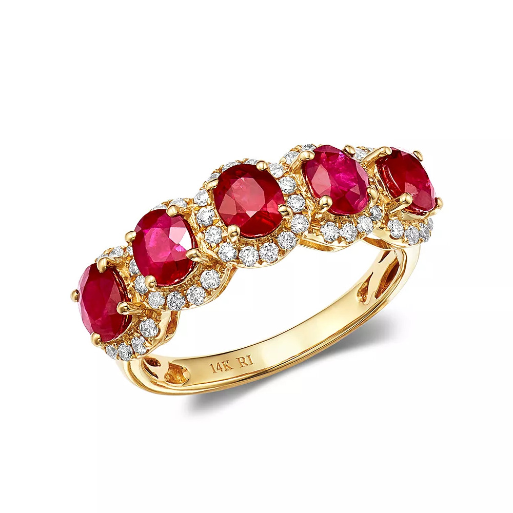 Amp up the glamour with five red hot oval rubies flanked by shimmering white diamonds.