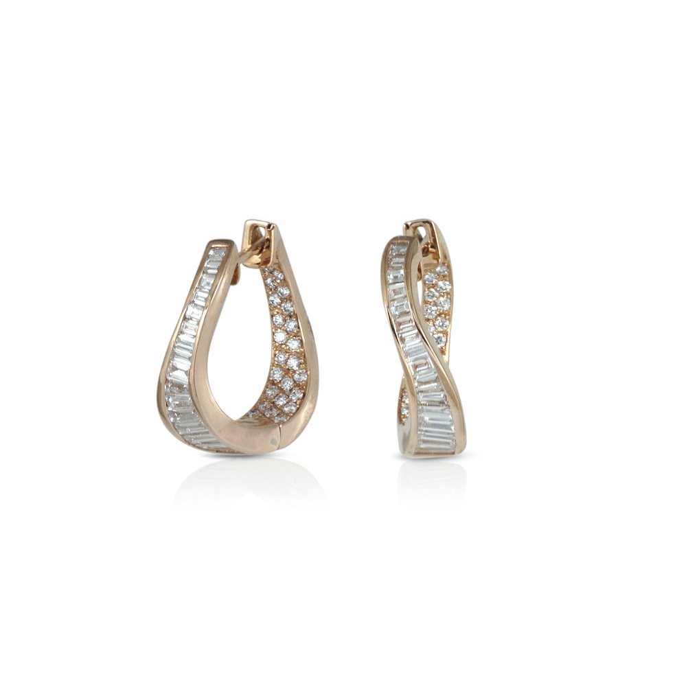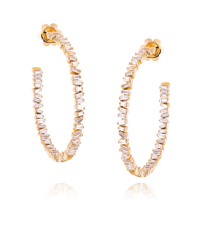 Stand out with these striking hoop earrings sliced for an upper half with round shaped diamond and the lower half with baguette shapes.