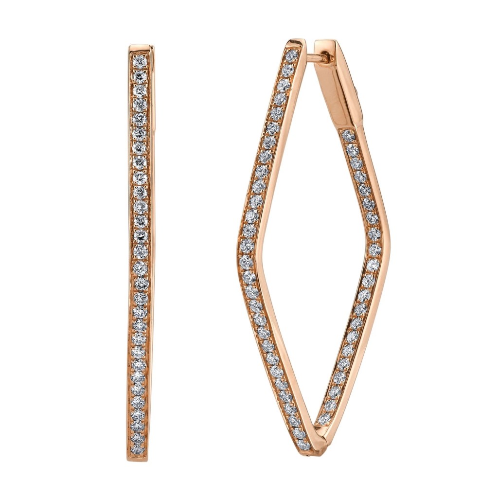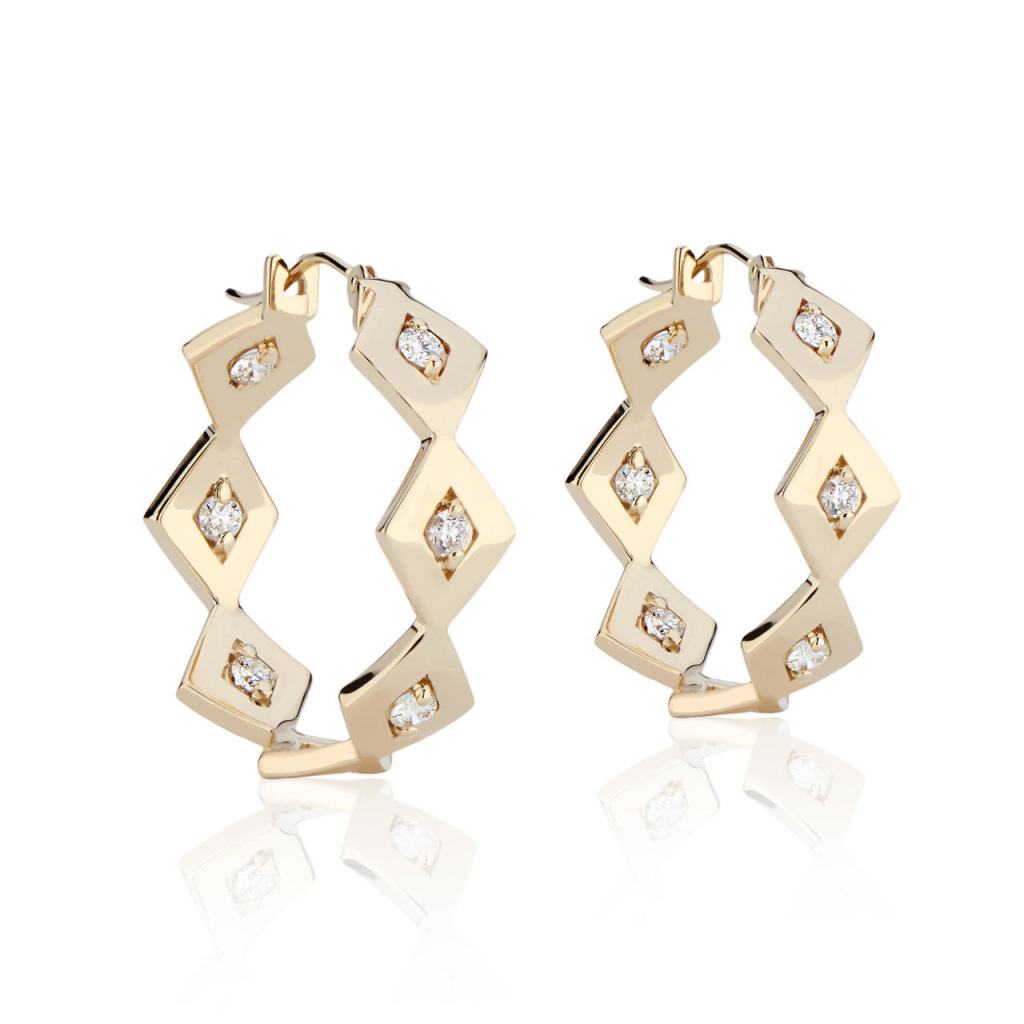 Diamond shaped hoop earrings studded with scintillating round diamonds from Los Angeles based Korean-American designer Anita Ko.