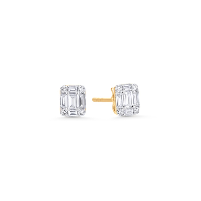 Round and baguette shape diamonds form a beautiful mosaic pattern to create elegant emerald shape earrings.