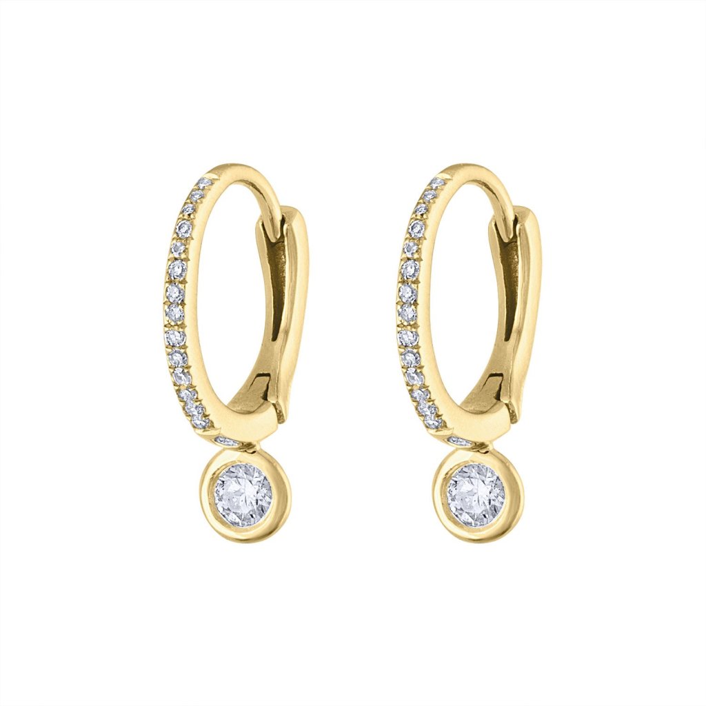 Petite huggie earrings studded with round diamonds and a bigger bezel set diamond dangling at the bottom.