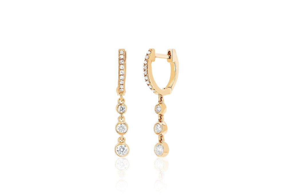Petite diamond huggie earrings with dangling bezel set round diamonds in increasing size.