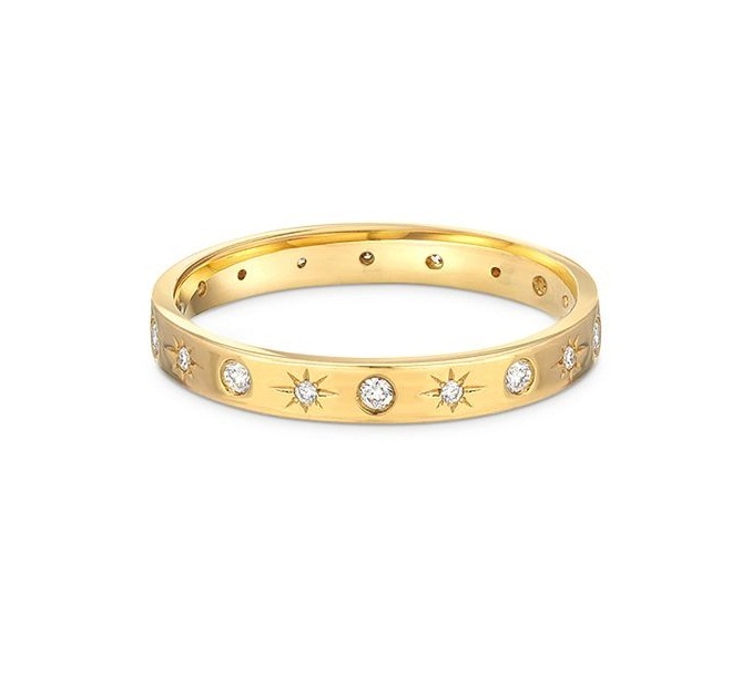 This stunning eternity ring with round diamonds and starburst motif will give you a celestial feel and can be worn as single or stacked.