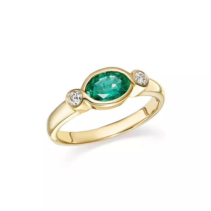 A fresh take on a classic style, two diamonds flank the center emerald in a bezel wrap setting.
