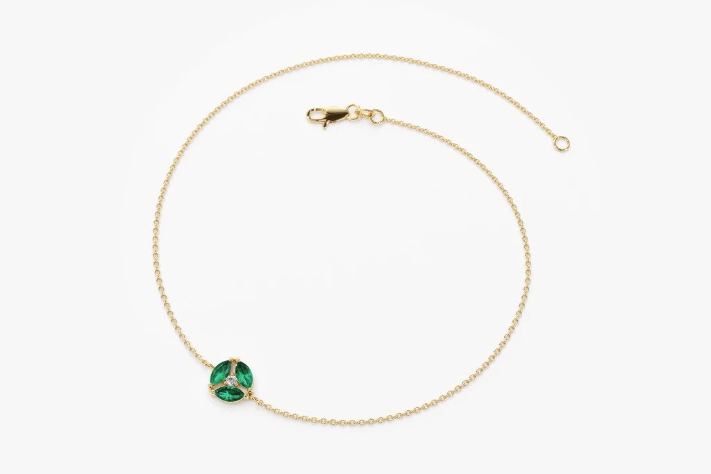 Three marquise shaped emerald stone encircle a diamond to form a petite circle.