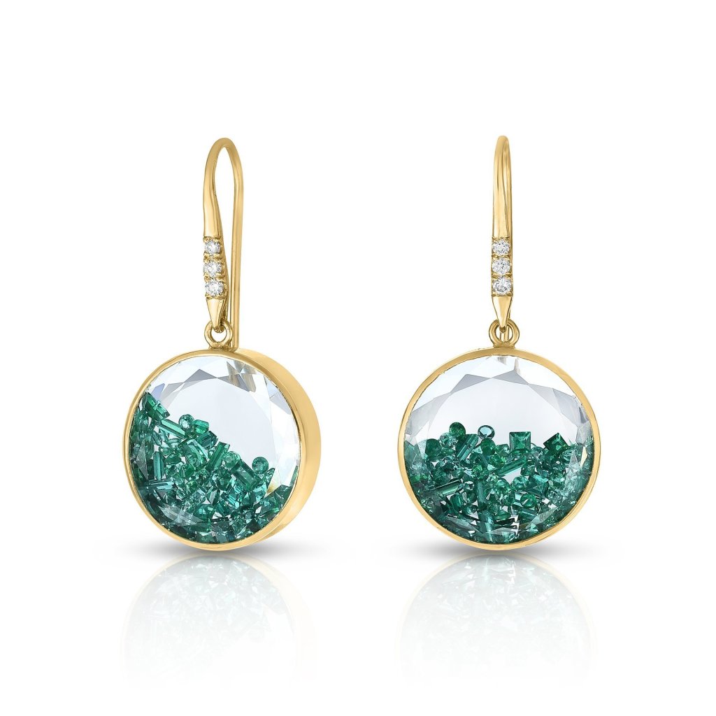 Crafted in 18 karat yellow gold, multi shape emerald stones move around in a white sapphire housing.