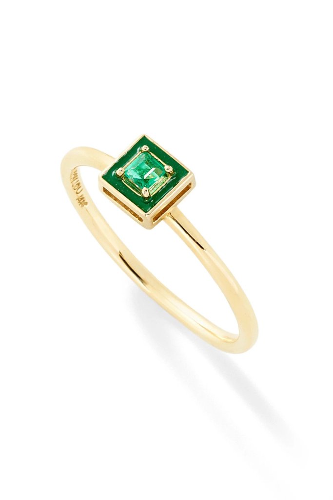 Green on the double here, a square emerald stone is enhanced by a green enamel border for a playful cheeky look.