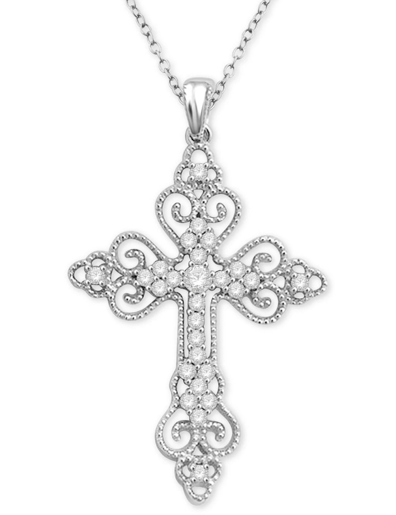 Ornate looking cross pendant adorned with charming filigree and shimmering white diamonds.