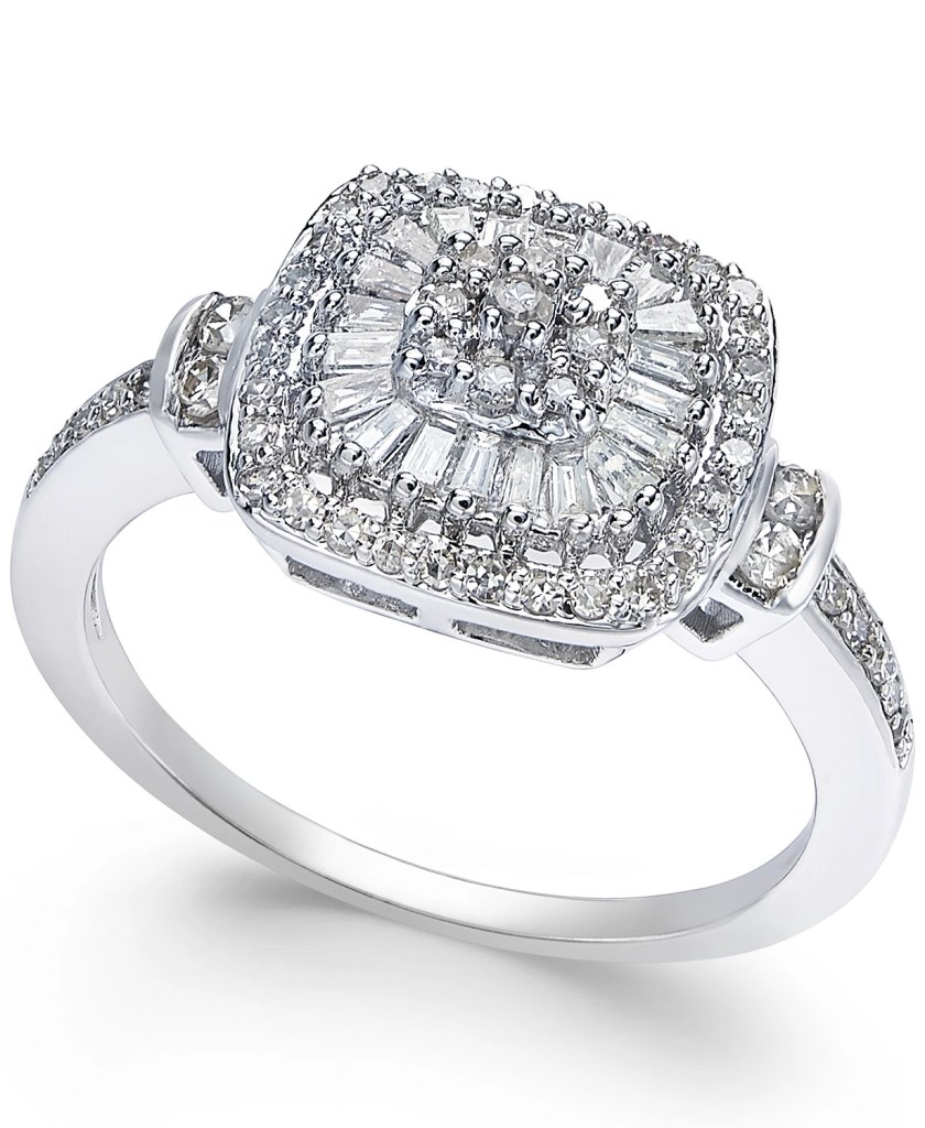 Crafted in 14 karat white gold and set with 1/2ct. of sparkling round and baguette tapper diamonds.