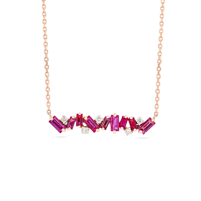 An edgy yet contemporary look from the talented designer Suzanne Kalan, it features a scattered setting of ruby baguettes, accented with white diamonds.