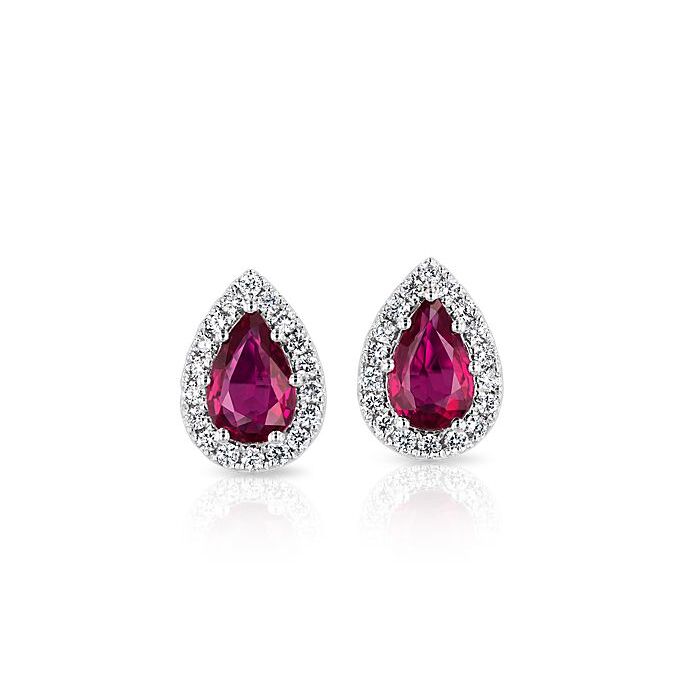 Pear shaped rubies are enhanced with a halo of white sparkling diamonds.