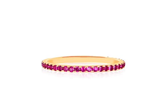 Petite band featuring round rubies set all the way around to form an eternity band.