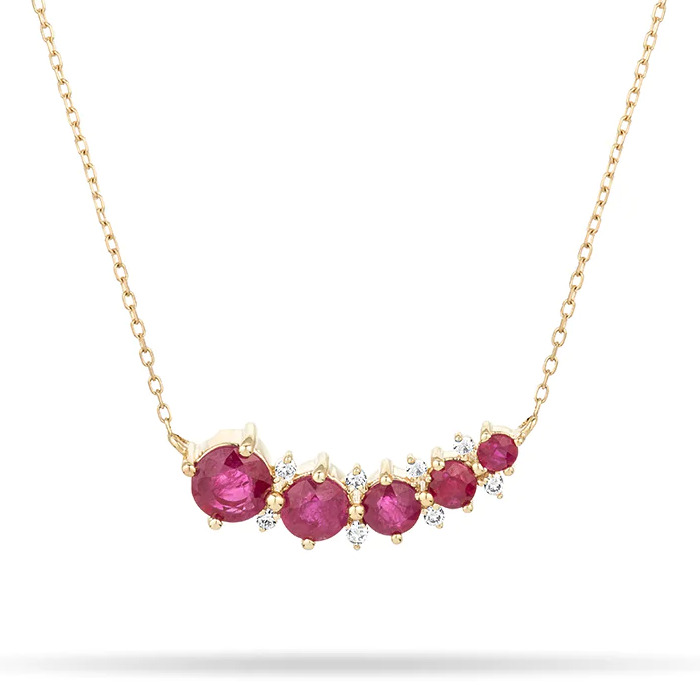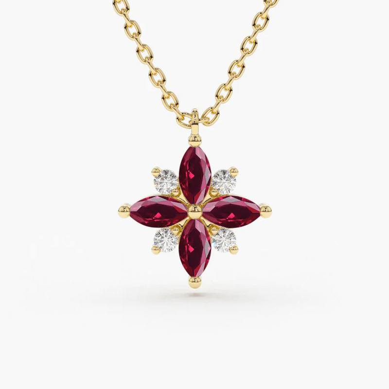 Marquise shaped rubies and round diamonds make for a gorgeous floral necklace, apt for every day wear.