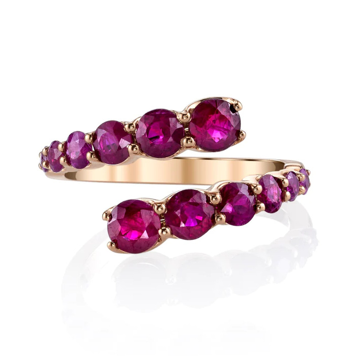Two rows of graduating ruby stones bypass each other in this trendy twist ring.