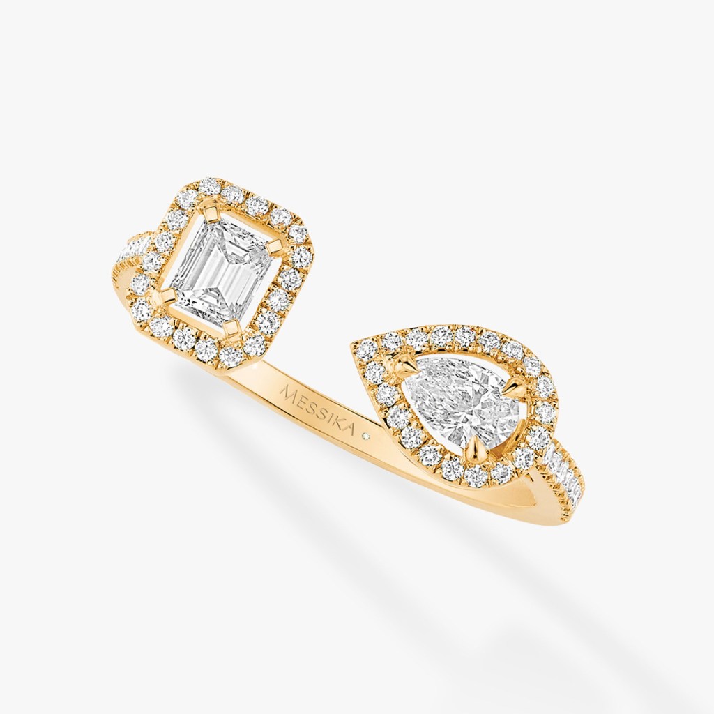 From the house of Messika, an internationally renowned brand in the world of high end jewelry, the ring features an elegant emerald and a posh pear diamond accented with round diamonds in the halo and the shank.