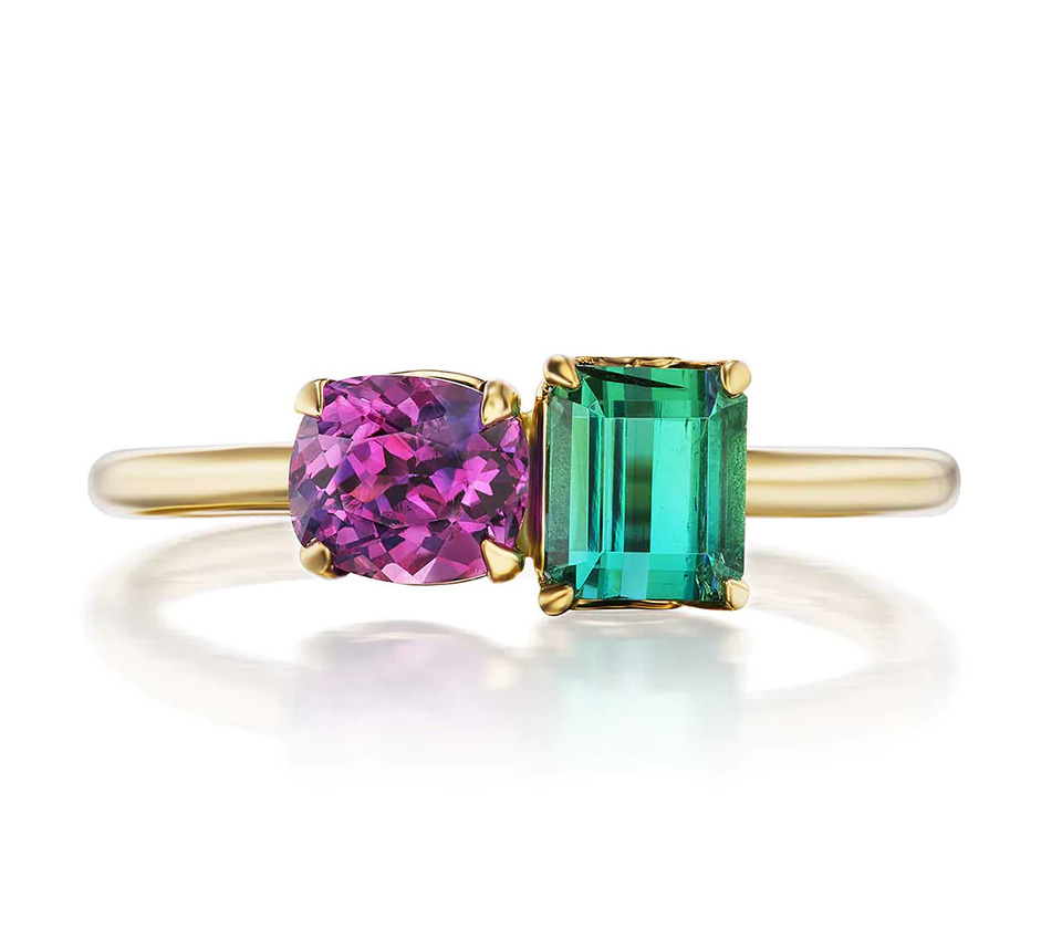 Vibrant colored gemstones of cushion cut pink sapphire and emerald cut green tourmaline make for an eye catching duo in this gorgeous ring inspired by the flora and fauna of the Irati forest in Spain.